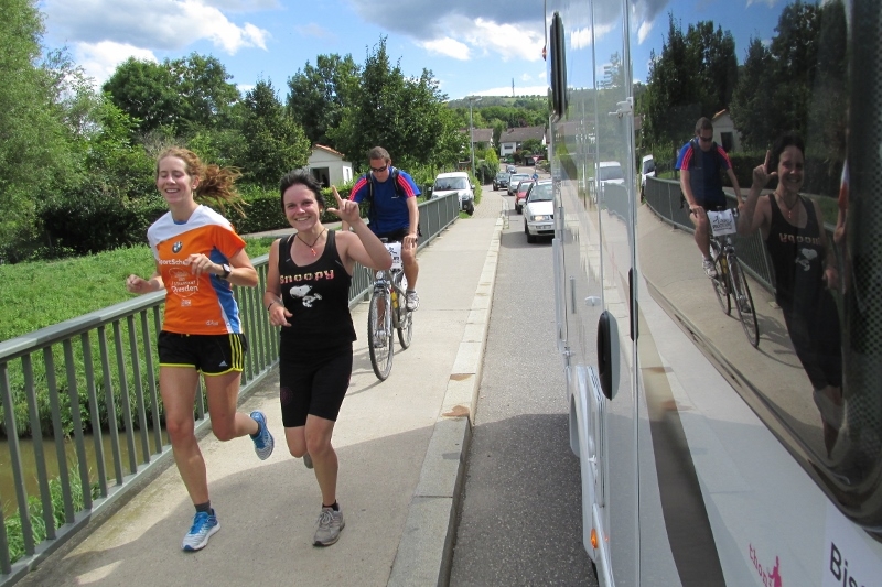 Der Wechsel um 2:00 Uhr nachts, wenn die Radbegleiter und Läufer sich zugleich ablösen, fand heute in einem idyllischen kleinen Örtchen namens Uttenhofen statt. Das Hauptregenfeld war schon wieder abgezogen und kaum, dass der nächste Läufer um 2:03 Uhr auf der Srecke war, kam ein Anruf vom Streckenhandy. "Das Fahrrad ist im Eimer" hieß es und sofort stürzte Matthias mit dem Ersatzrad los, um den Zeitverzug nicht größer werden zu lassen. Später berichtete Benno von seiner abenteuerlichen Elf-Kilometer-Etappe: Sie dauerte zwei Stunden, weil die Kopflampe ausgefallen war und er und sein Läufer Steffen Öhmi den Fahrraddynamo per Hand bedienen mussten, um besser erahnen zu können, wo der schlammige Weg im Regen mitten im Wald hinführt. Keiner konnte ahnen, dass das Chaos zu dem Zeitpunkt immer noch nicht ganz perfekt war. Steffen Kehrer durfte zwischen 4:20 Uhr und 6:30 Uhr eine Doppelschicht laufen, weil er und sein Wohnmobil sich verpasst hatten. Zum Glück haben die Läufer mittlerweile einen fast übernatürlichen siebten Sinn für die Länge der Streckenabschnitte bekommen. So rief Steffen sein Team noch rechtzeitig an, kurz bevor seine Laufstrecke einem Halbmarathon hätte entsprechen können, um seine Bedenken bezüglich der punktgenauen Übergabe an den nächsten Staffellläufer zu äußern. Nach ca. 10 Minuten, in denen er Zeit hatte, sich schonmal zu dehnen, fand der Bus ihn dann auch an der richtigen Brücke.
