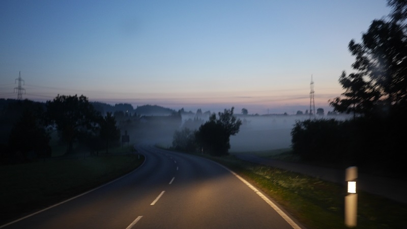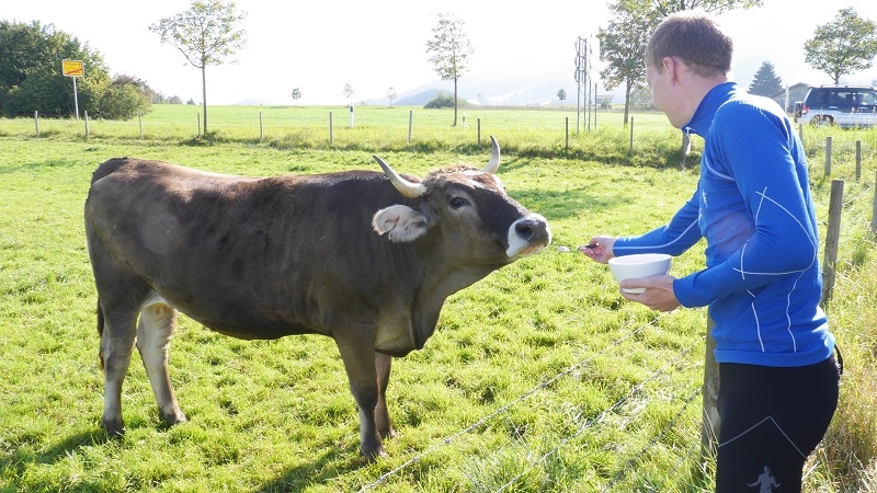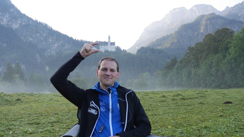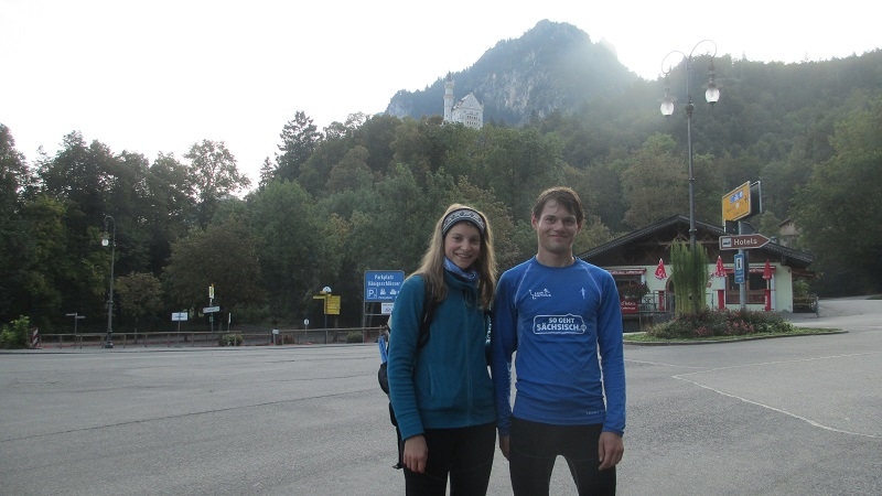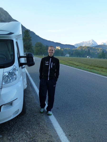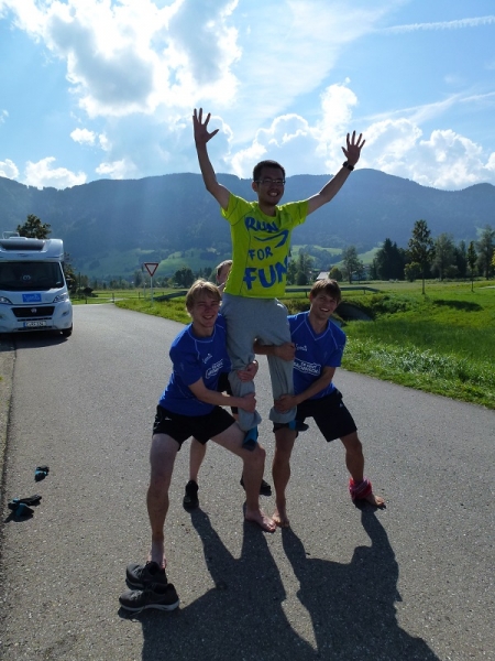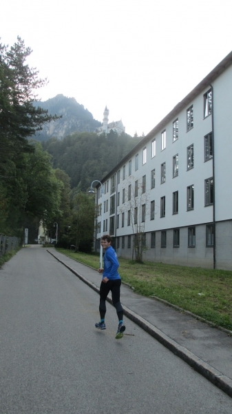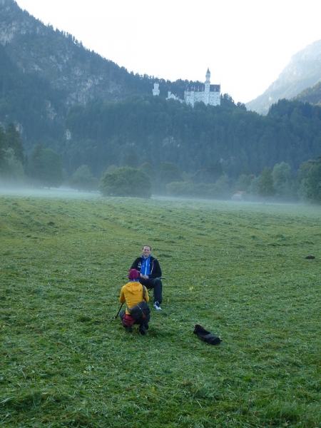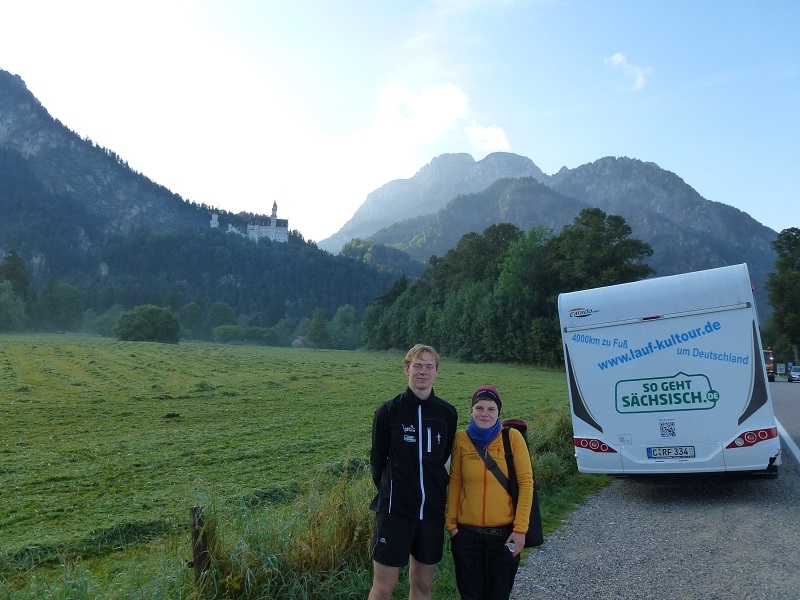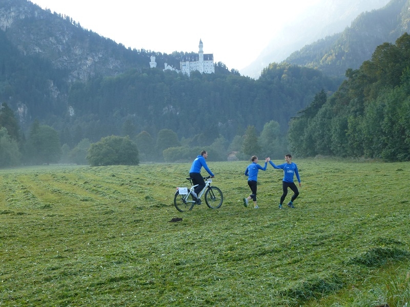 Der Reihe nach: Für diesen einen Tag hatten wir die ganze Tour vorgearbeitet, zeitweise über fünf Stunden Vorsprung herausgelaufen und dann doch gezittert, ob der Zeitpuffer reichen würde. Um sechs Uhr morgens übernahmen wir in Nesselwang den Staffelstab von Team 1. Unser Quartett, welches derzeit verletzungsbedingt leider nur noch als Trio laufen kann, hatte wunderbare Teilstücke: zunächst im Morgennebel über idyllische Almen zwischen glücklich grasenden Kühen hindurch, dann in der Morgensonne über Füssen zum Alpsee und zu Schloss Neuschwanstein und dann an Bergmassiven vorbei zum Bannwaldsee.
