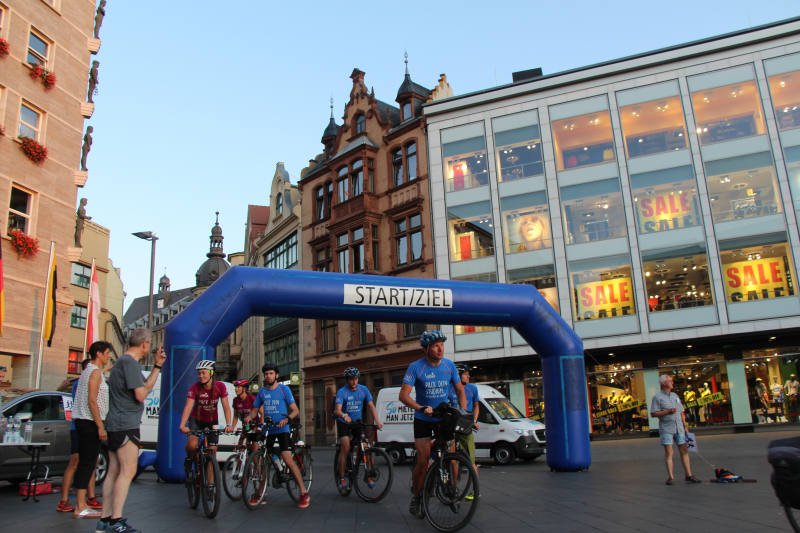 Aber alle diese Punkte wurden gemeistert und das Team erreichte um 20:15 Uhr (nach Zeitplan sollte es 20:00 Uhr werden) den Marktplatz in Halle und wurde dort von der Beigeordneten für Kultur und Sport der Stadt Halle Fr. Dr. Marquardt in Empfang genommen. Gegenseitig wurden kleine Geschenke überreicht und so durfte jeder von unserem Team eine Präsenttüte mit Hallorenkugeln und einem Säckchen Salz aus der Saline Halle mitnehmen. Auch André Cierpinski, der Sohn des zweifachen Olympiasiegers im Marathon (1976 und 1980) Waldemar Cierpinski, welcher Veranstalter des mitteldeutschen Marathons ist, baute sogar extra einen Zielbogen für uns auf.