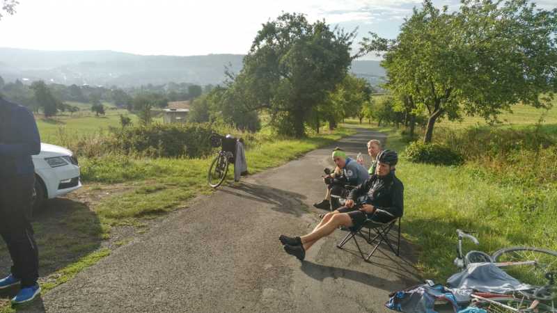 Der Morgen in Waldeck startete ohne große Worte, denn das Team hat nach sieben Nächten seinen Rhythmus gefunden und da wird nicht mehr groß gesprochen. Nachdem Lysander um 4:30 Uhr das Hallenlicht einschaltete und sich damit erneut nicht die besten Freunde machte, schälten sich alle aus ihren Decken bzw. Schlafsäcken, machten eine kurze Katzenwäsche, Frühstückten eine Kleinigkeit und packten die Taschen. Diese landeten auf einem großen Haufen in der Mitte der Turnhalle. Während sich das Sportlerteam dann in Richtung Mühlhausen aufmachte, brachte ein Teil der Begleiter die Taschen in die Transporter und der andere Teil verstaute das Essen und kümmerte sich um den Abwasch. Denn – und dafür möchten wir an dieser Stelle den Begleitern ein großes Lob aussprechen – die Sportler sollen sich auf das Radfahren und Laufen konzentrieren und sich drumherum um so wenig wie möglich Gedanken machen müssen.