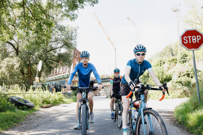 Team 2 und 3 starteten gemeinsam ca. 9:30 Uhr, die Läufergruppe war bereits seit 30 Minuten unterwegs. Diesmal hatten wir außerdem wieder Yannick als Unterstützungssportler dabei, welcher gestern Abend angereist war. Wir überquerten die Elbe über die Brücke „Most Dr. E. Benese“ und waren relativ schnell auf dem Elberadweg Richtung Dresden, auf dem sich ein sehr großer Teil der heutigen Etappe abspielte. Zu Beginn war es mit 14 Grad noch etwas kühl, dennoch entschied ich mich zum Glück etwas Dünneres anzuziehen, denn schon bald stiegen die Temperaturen und auch mir wurde zunehmend wärmer. Nach einigen Kilometern nutzten wir die nächste Brücke, die mit roten Blumen geschmückt war und fuhren wieder auf die andere Seite, nachdem wir uns eine kurze Pause mit einer Fotosession gönnten. Besonders beeindruckend ist hierbei die Aussicht auf das Sandsteinfelsmassiv „Schäferwand“ am gegenüberliegenden Ufer, auf dem sich ein Schloss befindet.