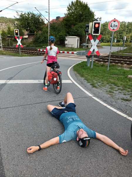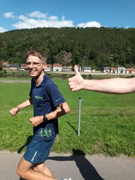 Die Temperaturen wurden deutlich wärmer und es war keine Wolke mehr am Himmel zu sehen- perfektes Laufwetter. Durch Chris hatten wir eine weitere Person im Team, sodass wir immer unterhalten wurden und lustige Video/Fotoideen umsetzen konnten: Bei meinem Wechsel vom Fahrrad zum Laufen wurde ich sofort nach dem Abklatschen von Thomas und Chris getragen, wobei Ellen unbeeindruckt weiterfuhr. Das Laufen ging heute deutlich besser als noch die letzten beiden Tage, obwohl die Reise mit Thomas und Chris nach ein paar Metern schon endete. Zwischenzeitlich war sogar Chris erstaunt, da er eigentlich plante bei mir etwas entspannter gehen zu können. Aber mit komplett durchgeschwitzter Hose hat er schließlich trotzdem die 30 Kilometer am Stück durchgezogen und eine erstaunliche Leistung gezeigt. Wir sind zunächst nach der Grenzüberschreitung durch Bad Schandau, einen sehr idyllischen Erholungsort, und anschließend durch Königstein gelaufen. Diese Orte sind besonders bei Wanderern beliebte Reiseziele, da der Weg zum Lilienstein und zur Basteibrücke nicht weit ist. Zu beiden Sehenswürdigkeiten hatten wir auf dem Weg eine sehr gute Aussicht. Unser Laufabschnitt endete im Kurort Rathen, nachdem Chris sich noch für eine ruhige Minute wartend vor der Bahnschranke hinlegte.