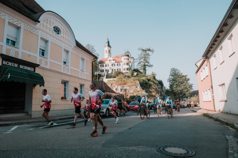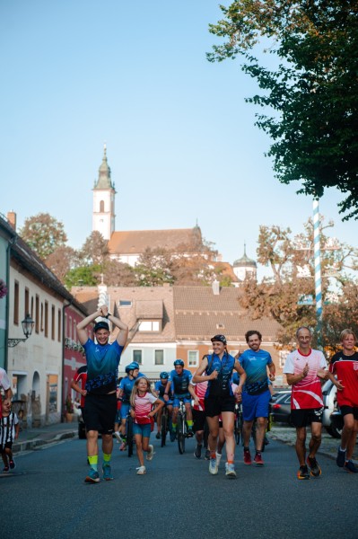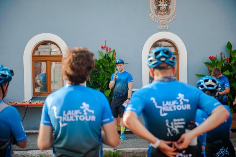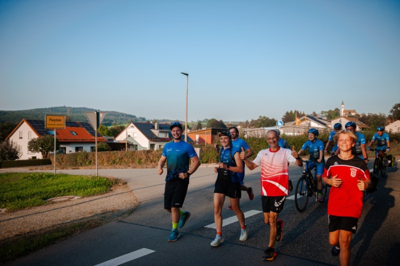 Etwas geschafft wurden wir jubelnd vom ortsansässigen Laufverein rund um Christian Enslein in Hagenmühle in Empfang genommen. Die letzten Kilometer bis zum Rathaus von Pleystein wurden gemeinsam mit allen Tourteilnehmern und den Läufern des Vereins absolviert. Auf der Route bis zum Hauptverwaltungsgebäude der Stadt wurden wir von den Einheimischen am Stadtweiher und der Kreuzbergkirche vorbeigeführt. Eindrucksvoll thront sie über der Stadt und geleitet uns dorthin, wo wortwörtlich die Musik spielte. Was für ein Empfang: Wir wurden wirklich sehr herzlich von der Vize-Bürgermeisterin Frau Andrea Lang in einem Ausmaß begrüßt, mit dem ich nicht gerechnet habe. Nach einem sehr großen Empfangskomitee, einer kleinen Ansprache zur Bedeutung unserer Tour vom Tourchef und ein paar Snacks später, ging es nun zu unserer Unterkunft im Vereinshaus. Und was gibt es hier? Ein riesen Buffet und Gegrilltes zum Abendessen! Dazu die Möglichkeit Networking zu betreiben, die Leute vom Verein und der Stadt Pleystein kennenzulernen. Das bleibt in Erinnerung! Später bezogen wir unsere Schlafplätze und waren ein wenig froh, recht schnell im Bett zu liegen.