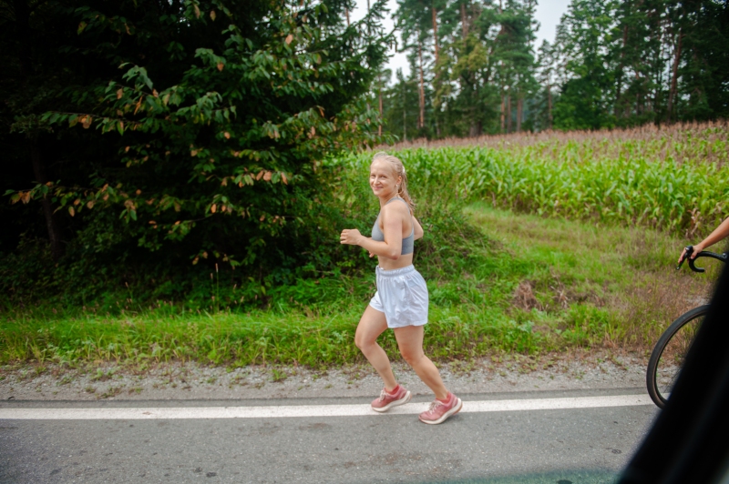 Als der zweite Wechsel erfolgt, zeigt sich wie intensiv die Crew hinter den Sportlern auf deren Wünsche eingeht. Sally, die sich eine kühle Dusche gewünscht hatte, erhält unmittelbar nach dem Abklatschen mit mir einen Schwall kaltes Wasser. Etwas neidisch auf die Erfrischung starten wir nun also unseren Laufpart. Dabei werden wir von Thomas unterstützt, der gern mal den Transporter gegen die Lauschuhe tauscht. Er übernimmt ein paar Kilometer und entlastet damit eine Achillessehne – DAS IST TEAMWORK. Es erwarten uns einige fiese Anstiege, wenig Schatten und Hitze – eine lustige Kombination. Vielleicht lag es an genau dieser Kombi, dem fehlenden Schlaf oder doch einem technischen Problem, auf jeden Fall verpatzen wir den zweiten Läuferwechsel. Aber egal, heute sind die Distanzen nicht so groß und wir liegen zeitlich im Plan. Und dann passiert zum Abschluss wieder das, weswegen wir die ganze Nummer ja eigentlich machen: zuerst stoßen einige Sportler des TSV Simbach zu unserem Lauf-Team und wir können bereits kurz über unser Projekt berichten. Später folgt der Empfang des ersten Bürgermeisters im Ratssaal der Stadt sowie ein herzliches Willkommen in der nagelneuen Turnhalle des TSV. Wir werden dort sogar mit reichlich Käsespätzle verwöhnt, sodass (mal wieder) niemand hungrig ins Bett geht.