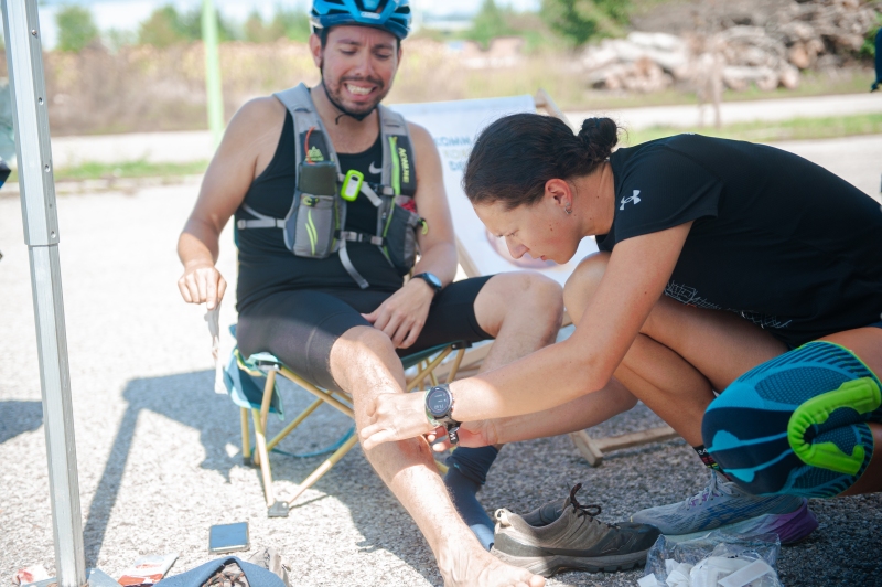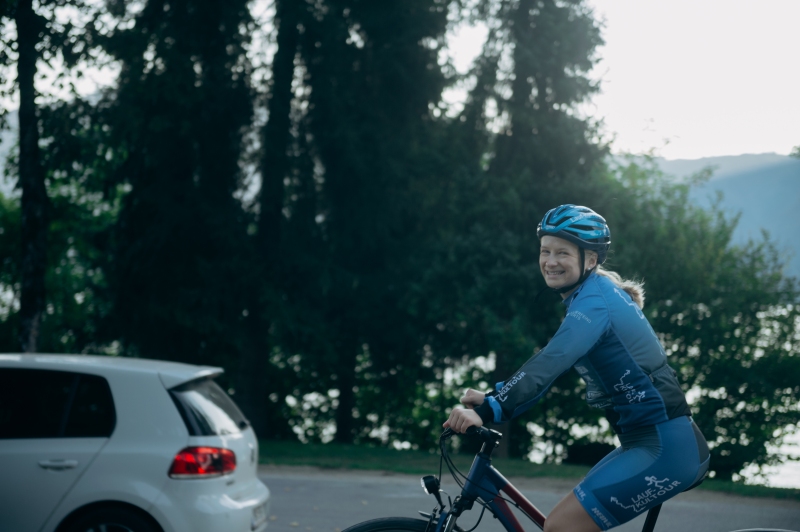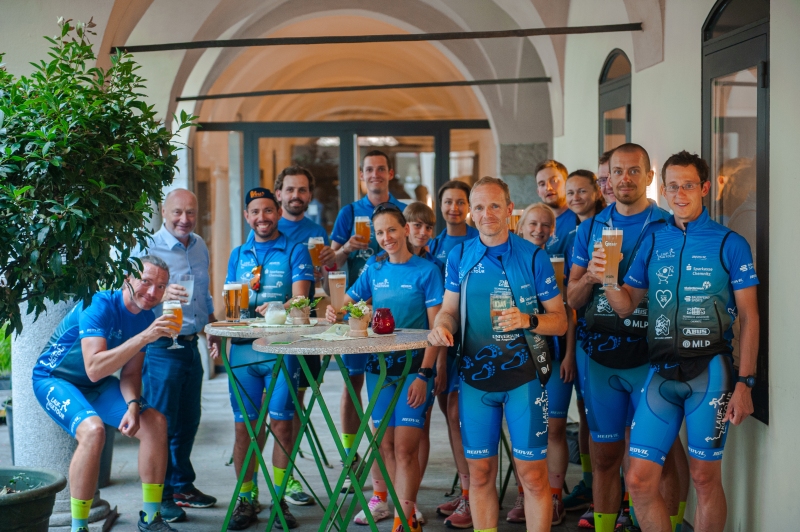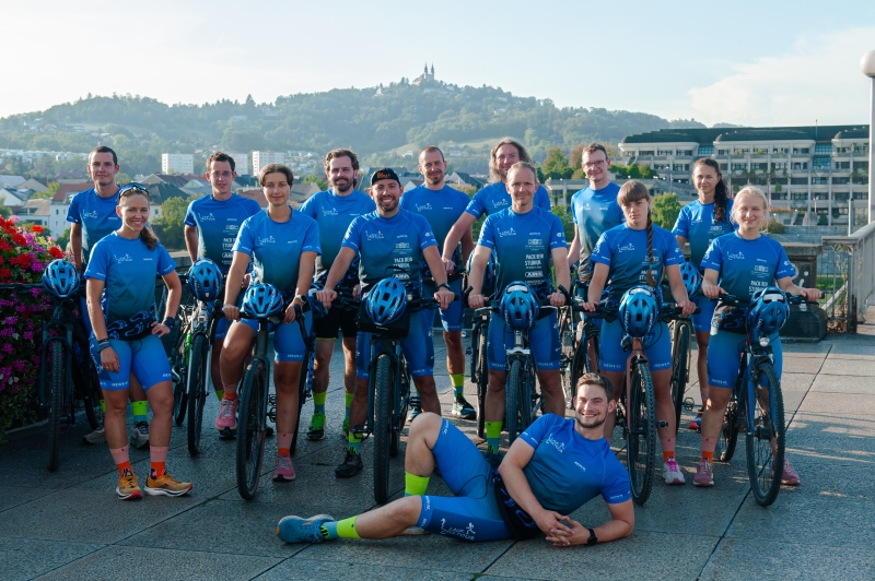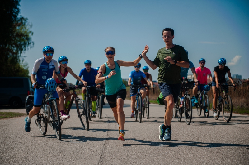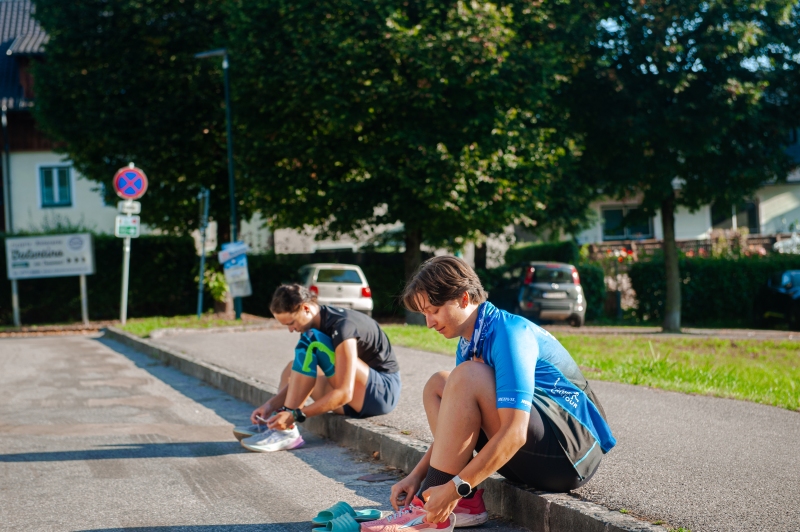 Daniel hatte am gestrigen Tag noch mit Problemen an der Achillessehne größtenteils ausgesetzt, doch seine heutige Etappe von schonenden 4 km spulte er mit einer unfassbaren Motivation ab. Temposplits von 3:50 und 3:35 min/km wurden von seiner BoomBox durchgesagt, während „Titanium“ oder „99 Luftballons“ liefen. Der Wechsel auf unseren Teamkapitän Thomas, der das Team trotz Strapazen im Laufe des Tages (Spoiler!) wie immer in sicheren Fahrwassern hielt, stand dank Daniels Tempo früher an als geplant. Doch erstmal kein Problem: Wechsel, Florian und Daniel bleiben kurz zurück, Thomas und ich bewegen uns weiter fort: „Sie haben die Route verlassen“. Na klasse, was heißt das denn jetzt? Kurz die Route gecheckt: Wir hatten uns verquatscht und die falsche Route gewählt. Halb so schlimm; also einen kurzen Grashügel gewählt und schon waren wir wieder zurück auf dem Track. Nur Florian und Daniel hatten uns bereits überholt und ballerten ihre Radkilometer durch. Sie fragten sich, wann sie uns denn endlich einholen würden. Ein kurzer Blick auf unser Livetracking (Hier geht's zu unserer Live-Map) verriet uns, dass die beiden uns überholt hatten. Ein kurzer Anruf löste das Problem und Team 1 konnte gemeinsam weiter Richtung Traunsee fahren/laufen, wo uns ein traumhaftes Panorama erwartete.