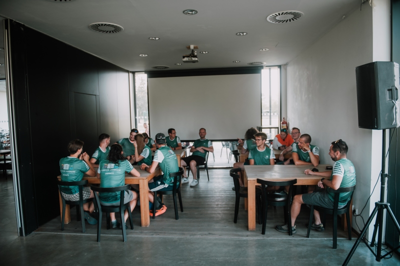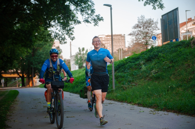 Als Nachtquartier diente eine Turnhalle, früh um 05:00 Uhr weckten uns die Betreuer mit Wachmacher-Musik und der Turnhallen-Deckenbeleuchtung. Das Frühstück wurde kredenzt, ich war beeindruckt von der Auswahl an Köstlichkeiten, die das Betreuerteam zur Verfügung stellte. 07:00 Uhr startete ich in Team 2 mit Teamleiter Björn sowie Matteo und Kai zur ersten Radetappe. Bereits um diese Uhrzeit war anhand der fehlenden frischen Morgenluft zu erahnen, dass es ein heißer Tag werden würde. Das Höhenprofil hielt, was es versprach – die ersten ca. 10km ging es in Serpentinen etwa 400 Höhenmeter nach oben. Schön: der Sonnenaufgang über dem Fluss und der Blick von oben auf die Stadt. Team 1 startete die Etappe im Duathlon-Prinzip – Respekt an Florian als Läufer! Kurz vorm Wechselpunkt Eins nach 35km sollte uns noch ein unangenehmer Zwischenfall erwarten … Ein Radler, dem unsere Motivationsmusik missfiel, schnitt uns plötzlich wutentbrannt den Weg ab, was zu einem Auffahrmanöver des Teams und einem Sturz meinerseits mit blutigem Knie führte. Danke dafür. Naja, nur noch ein paar Meter, dann wurde ich umfassend medizinisch mit sterilen Kompressen und Wundspray versorgt. Für Snacks war auch gesorgt, wieder wurde ich Zeugin des Rundum-sorglos-Pakets, dass die Betreuer auf die Beine stellen.