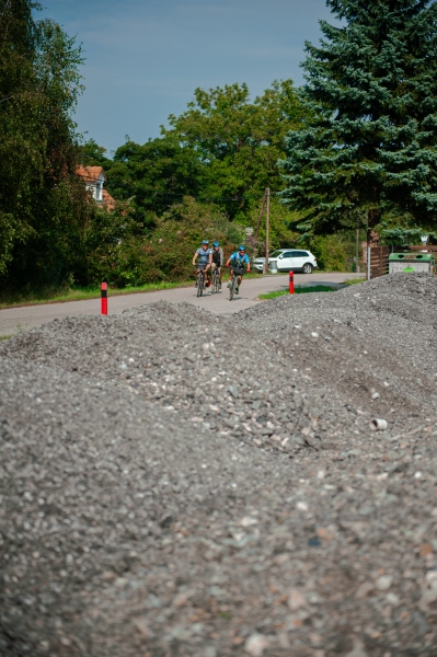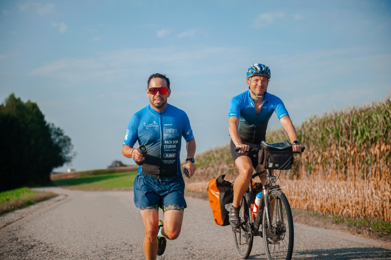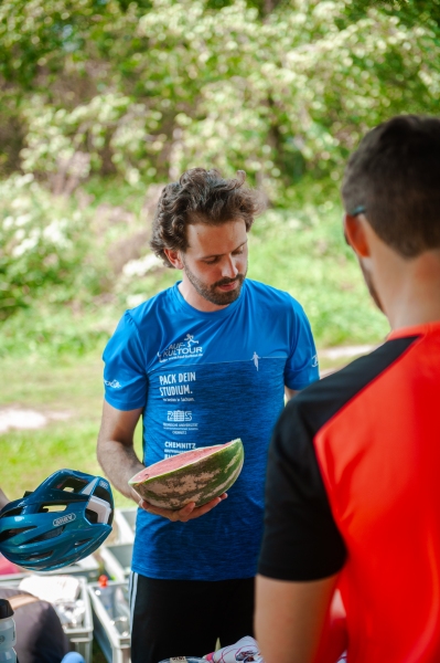 Auf dem zweiten Drittel der Tagesstrecke, die wir im Duathlonprinzip nach Übergabe des „Staffelstabs“ von Paul aus Team 1 an Kai zurücklegten, begleitete uns Chris, was mir wortwörtlich den Ar… rettete – er übernahm Kais Rad und ich konnte im Tausch auf das Lauf-KulTour-Rad ausweichen. Nach vielen Kilometern auf dem Rad freute ich mich auf meine erste Laufetappe. Welche bei Mittagshitze und weiterem „welligen Profil“, wie es etwas euphemistisch im Vorab benannt wurde, dennoch anspruchsvoll für mich war. Die ersten beiden Etappen verbuche ich unter einem gedanklichen „Nicht-schon-wieder-ein-Anstieg…“. Trotzdem verliefen alle teaminternen Läufer-Wechsel problemlos und nach weiteren etwa 35km erreichten wir Wechselpunkt 2, übergaben an Team 3. Danach wieder Rundum-sorglos-Paket und eine etwas längere Verschnaufpause mit Energiereserven auffüllen.