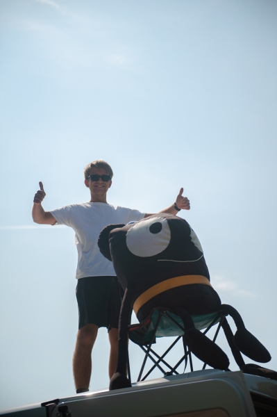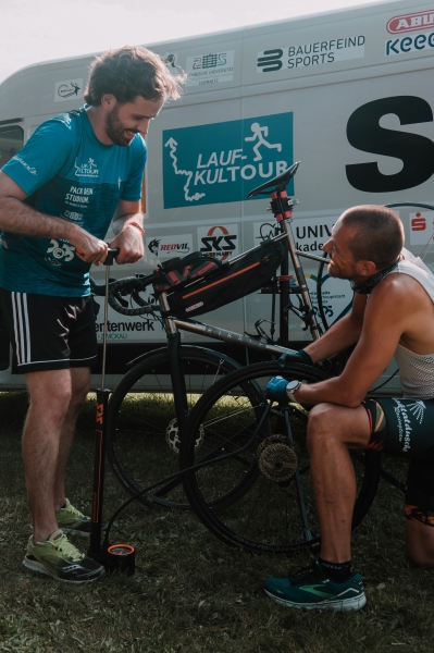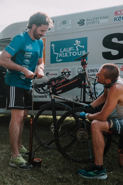 Team 1 blieb aber nicht von weiteren Vorfällen verschont, trotzdem es nur noch 8km zum Wechselpunkt waren. Kurz nachdem der Transporter Paul und sein Rad abgeholt hatte, gab es den nächsten Platten bei Florian. Das ließ sich aber verhältnismäßig schnell lösen, sodass Team 1 nur mit leichter Verzögerung am Wechselpunkt eintraf.