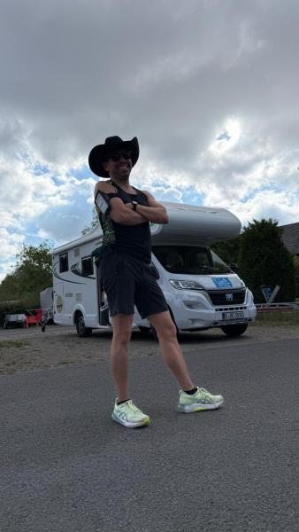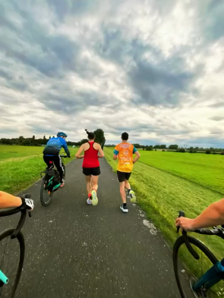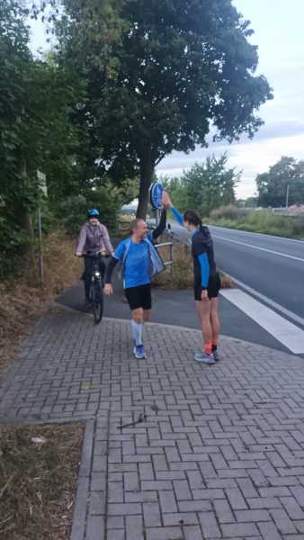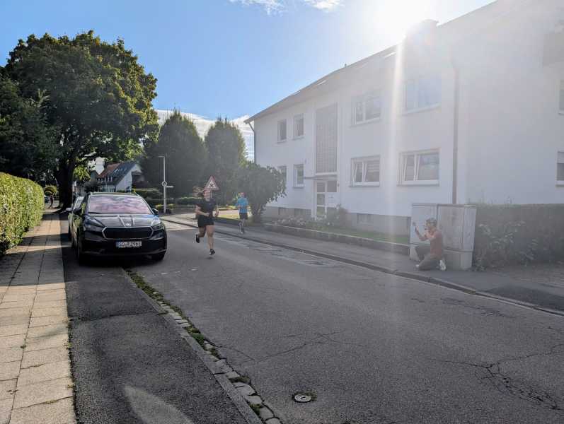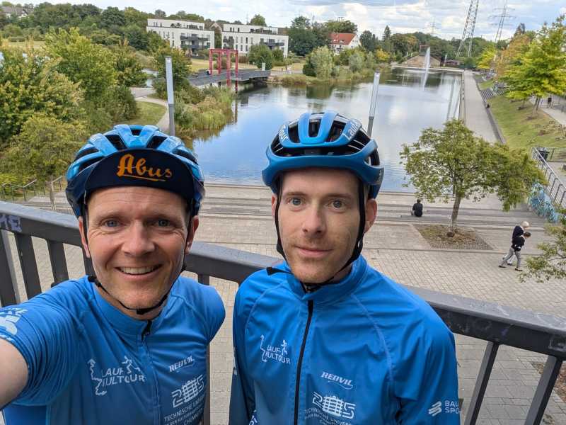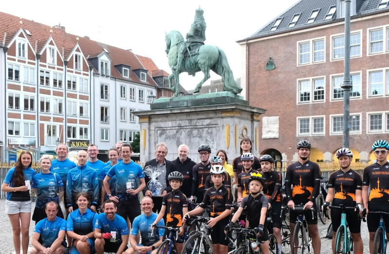 Auf Sally und Kilian - unsere beiden Läufer bis zum Düsseldorfer Rathaus - wartete außerdem noch eine besondere Überraschung: Die beiden wurden ab kurz vor Düsseldorf vom Radverein "SG Radschläger Düsseldorf" in Empfang genommen und von einigen Freiwilligen bis zum Rathaus begleitet. Bei dieser Kulisse war sogar der anhaltende Gegenwind glatt vergessen.