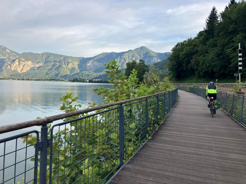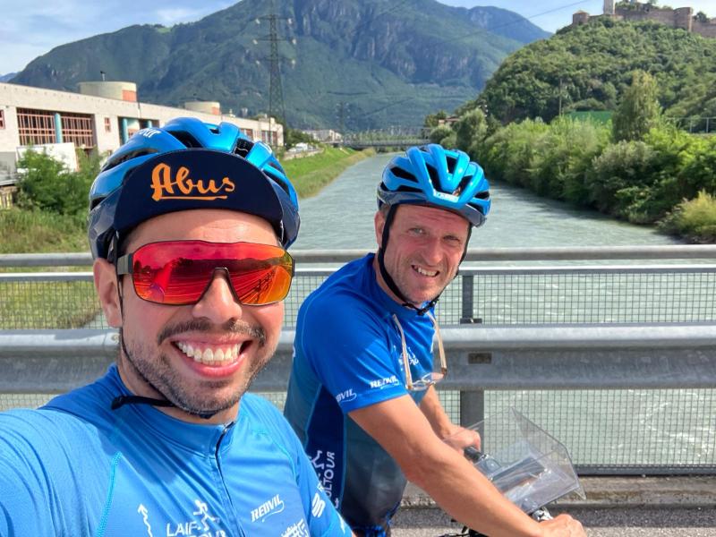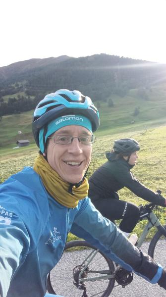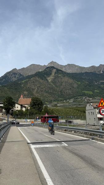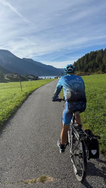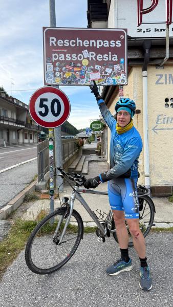 Gemeinsam mit Julia startete der erste Radabschnitt des Tages. Auf beide wartete der Reschenpass und als Ziel der Reschensee. Ein Pass, den Kilian bisher nur von Erzählungen und Bildern von anderen Radsportfreunden kannte. Als jemand, der die Berge beim Laufen und Radeln liebt, hatte er daher am Vorabend dafür votiert, gern dort hochradeln zu dürfen. Zusammen mit Julia fuhren beide dick eingepackt bei etwa 5°C los. Die ersten 30 km gingen durch verschlafene Alpendörfer. Die Wege abseits der Straßen wurden stetig steiler und schon bald waren beide am Fuße des eigentlichen Anstiegs. Von der Schweizer Seite aus ging es nun die Kehren hinauf. Die Sonne kam allmählich heraus und so genossen beide das herrliche Panorama im Sonnenaufgang. Wirklich eine Gegend zum Verlieben. Egal wo du hinguckst geht dir das Herz auf. Beide fuhren weiter die Kehren hinaus, doch irgendwann merkte Kilian, dass er seine Trinkflaschen im Wohnmobil vergessen hatte. Kein Problem - dann eben ohne zusätzliches "Trainingsgewicht" an Berg hinauf. Hatten beide Freude am Pass?