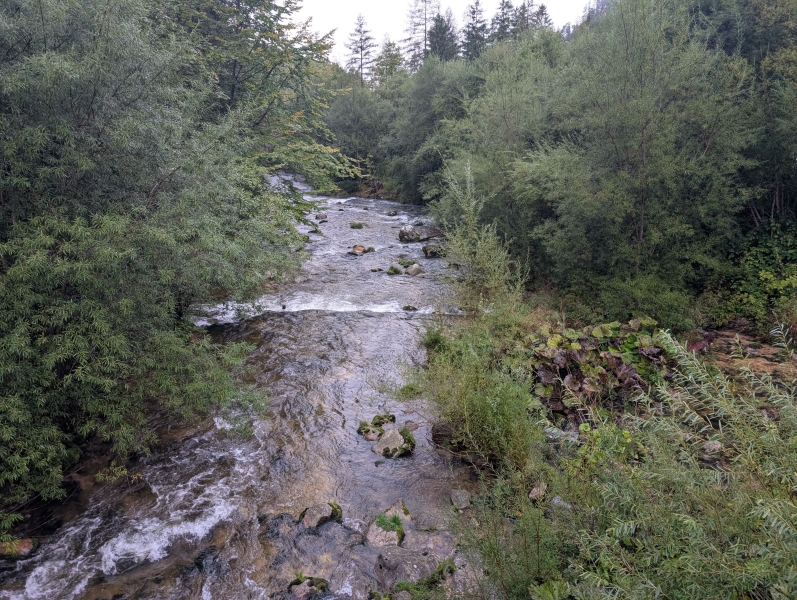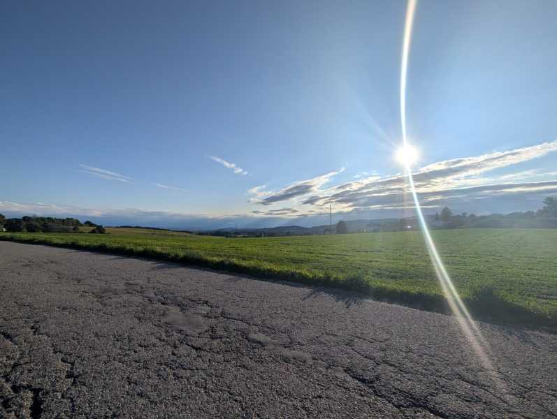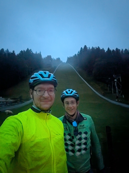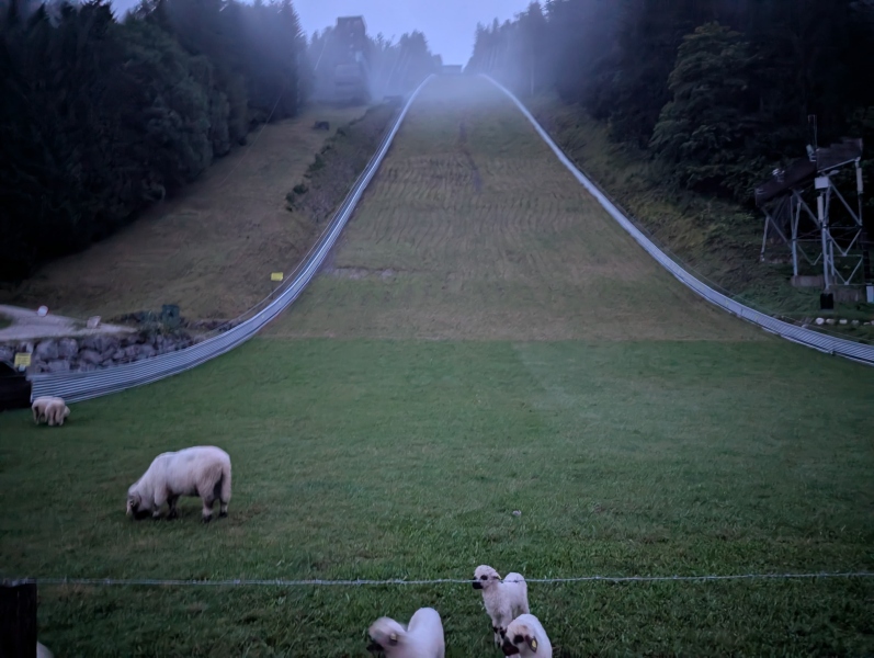 Im Morgengrauen wurden also bereits die ersten knackigen Anstiege des Tages erklommen. Der höchste Punkt der Etappe wurde dabei nach knapp 20 km erreicht. Vorbei an alpinen Pisten und einer Skisprungschanze, auf deren Auslauf eine kleine Herde Schafe graste.