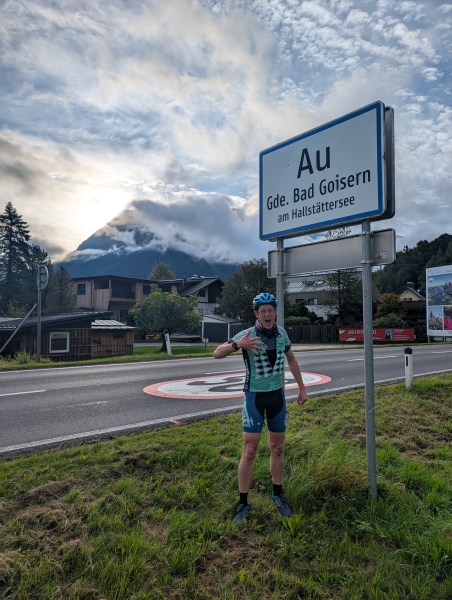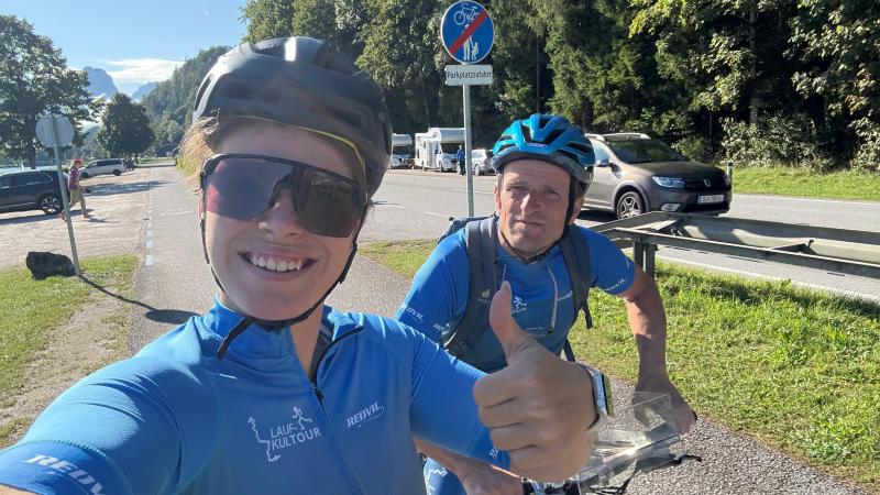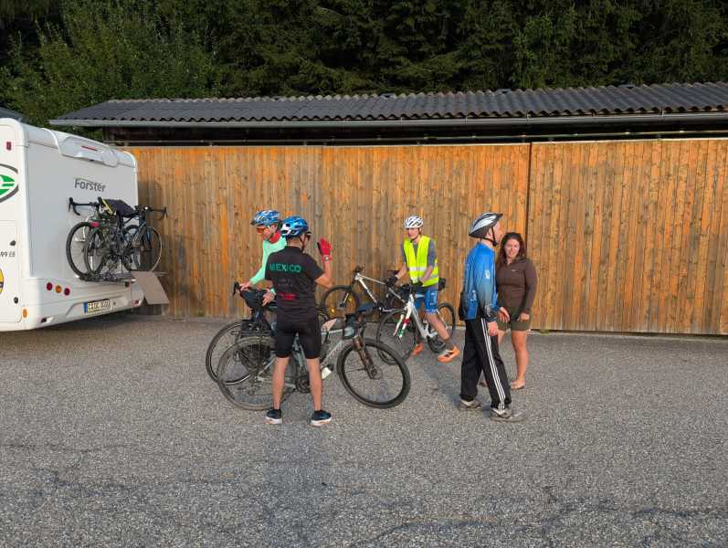 Nach zwei, drei Erinnerungsfotos von Daniel auf dem Hauptplatz, wo in den Vorjahren stets unser Empfang als Tagesendpunkt stattgefunden hatte, ging es dann noch die letzten 10 km zum Wechselpunkt hinauf. Dabei kam den beiden auf halber Strecke Kilian entgegen, der scheinbar neben der Radfahrt am Morgen und der anschließenden Schwimmeinheit noch den Triathlon für heute voll machen wollte und deshalb nochmal die Laufschuhe schnürte.